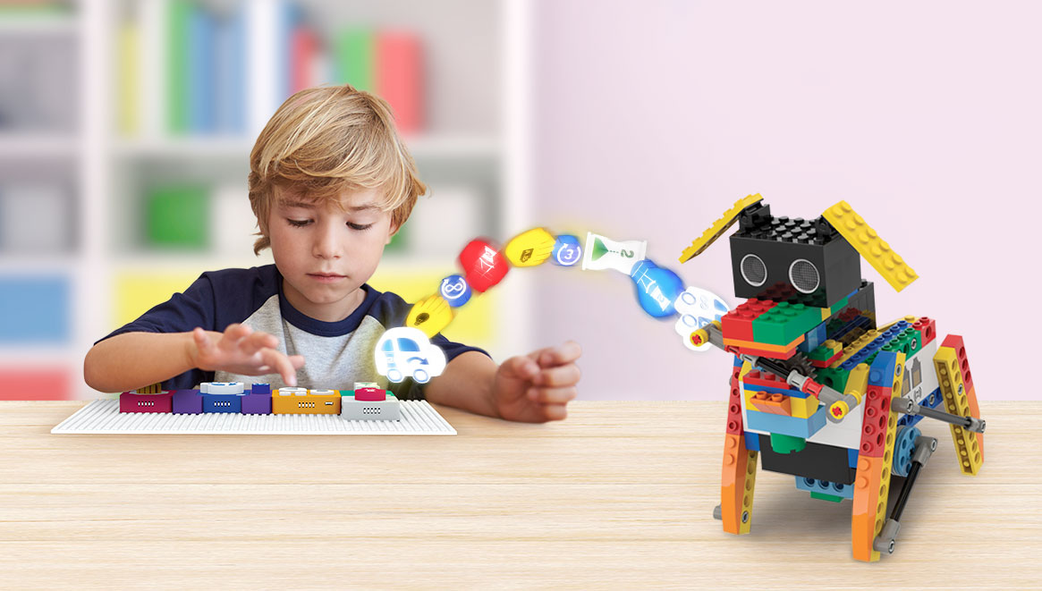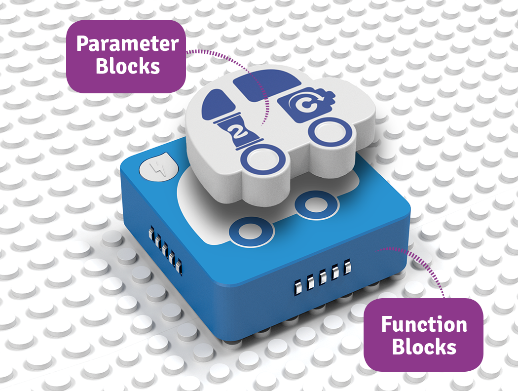 In the AlgoPlay curriculum, utilizing the coding language of Algobrix®, students first assemble a building block model. They then formulate various code sequences using tangible or screen function and parameter blocks. By activating the “play” block, the robot executes the coding sequence. When students combine function and parameter blocks, they instruct the robot with specific commands, like moving forward or activating a red light.